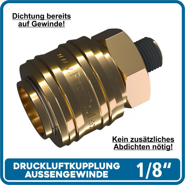 ProfiPaul Messing-Druckluftkupplung 1/8 mit Aussengewinde, Standard-Norm: DN 7,2 (anderen Normen, auch metrisch, auf Anfrage). Alle AUSSENGEWINDE SIND BEREITS MIT DICHTUNGSMASSE VERSEHEN, deshalb kein Abdichten mehr erforderlich! Hochwertige, robuste und langlebige Schnellverschlusskupplung mit hohem Durchflusswert.
